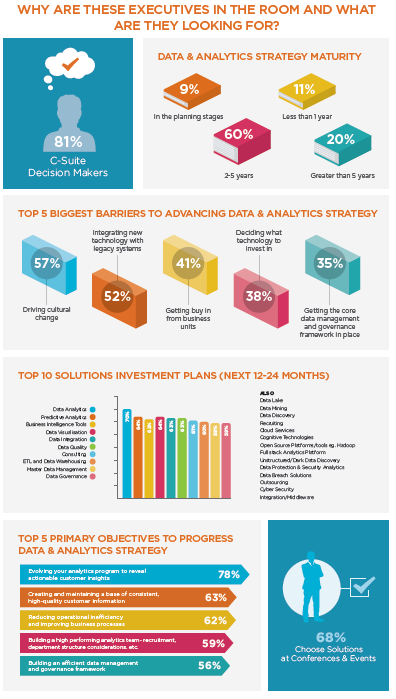 Meanwhile, the Chief Analytics Officer Survey also looked at the respondents’ investment plans and a whopping 70% of all respondents (81% of whom are C-Suite Decision Makers) revealed that they plan to invest in Data Analytics solutions in the next 12-24 months, followed by Predictive Analytics solutions (64%) and Business Intelligence tools (62%). It’s also interesting to note that 68% of them choose solutions at Conferences and Events.